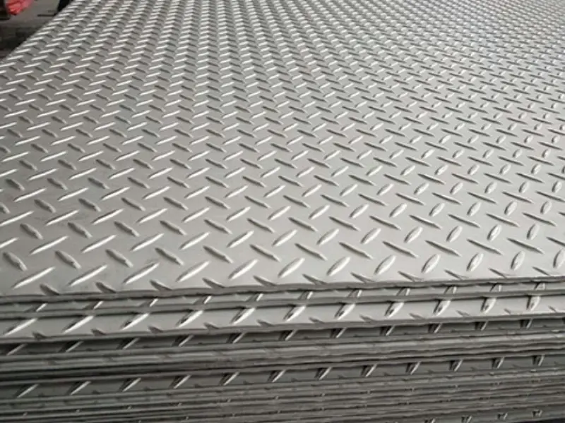 Una placa acanalada es una lámina metálica con un patrón elevado (en forma de diamante o barras) diseñado para aumentar la fricción y evitar resbalones.